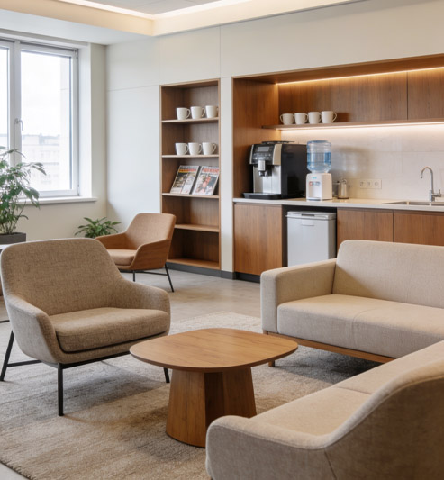 Kényelmi szolgáltatások: közös használatú tárgyaló, kávézó/pause helyiség